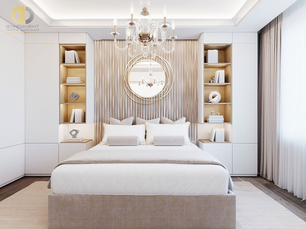Еще одна зона, которую чаще всего просто больше негде обустроить – это гардеробная. В квартирах, да и большинстве частных домов нашей страны не предусмотрено выделять отдельное помещение под системы хранения гардероба. Встроенный большой шкаф в спальне вполне способен заменить (хоть и не в полной мере) подобные системы хранения. Для того чтобы монолитное сооружение от пола до потолка не утяжеляло образ помещения и визуально расширяло пространство, лучше всего использовать светлые, даже белоснежные оттенки для исполнения систем хранения.