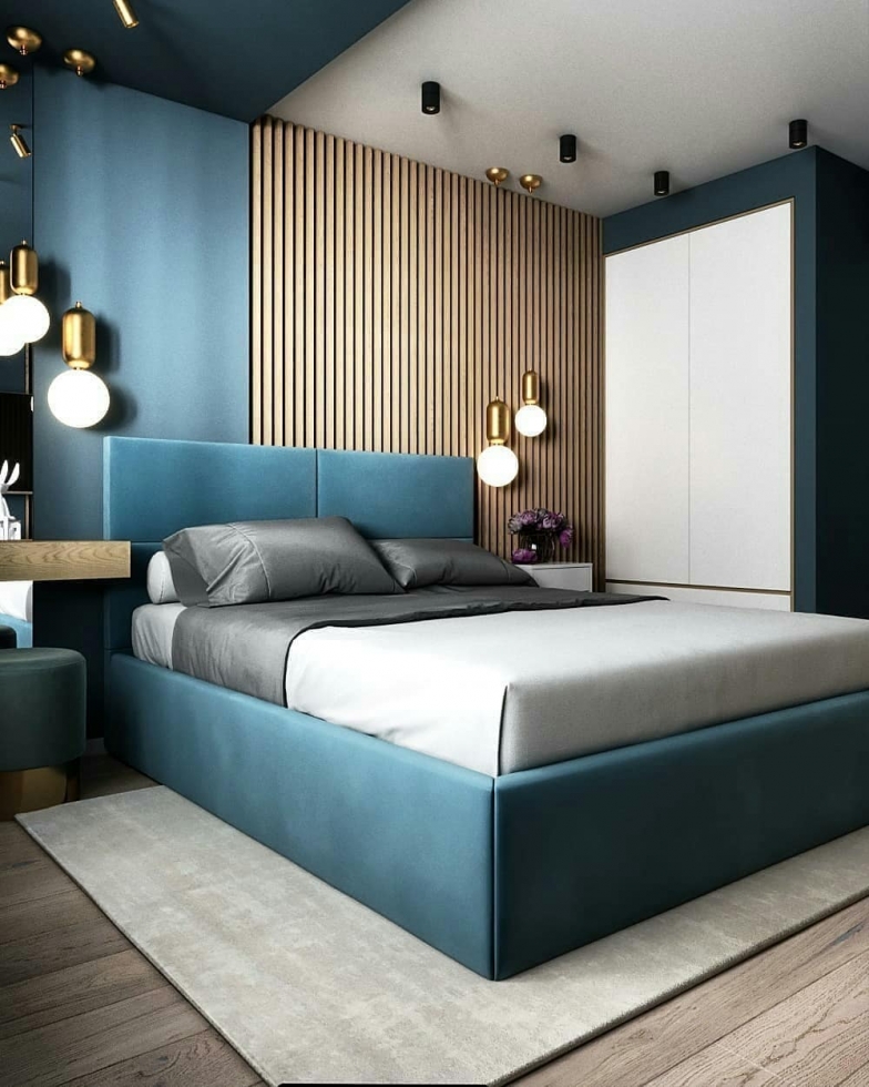 Синий в дизайне спальни используют для создания атмосферы свежести, легкости. Синие тона прекрасно сочетаются с зеленым, лаймовым, розовым, сиреневым. К основному оттенку подойдут также цвет морской волны и белый. Однако в интерьере не должно быть большого количества ярких оттенков.