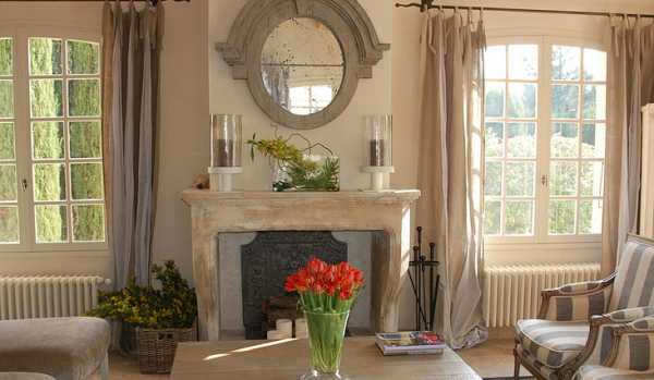 В качестве декора в интерьере используют глиняные или стеклянные вазы наполненные цветами, керамические и фарфоровые фигурки, диван заполняют разнообразные подушки. Основным акцентом зала станет фальш-камин у одной из стен, он может быть выполнен в цвет стен или классического для прованса белого оттенка.