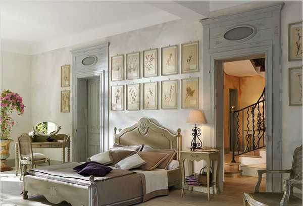 Спальня в романтическом провансе выглядит нежно и мило. Выбирайте постельное белье с рюшами и оборками из льна и ситца, занавески в цветочек, зеркала в металлических рамах, изящные коврики и вазы с цветами. Мебель должна быть изящной, с изогнутыми ножками, резными спинками светлых тонов.