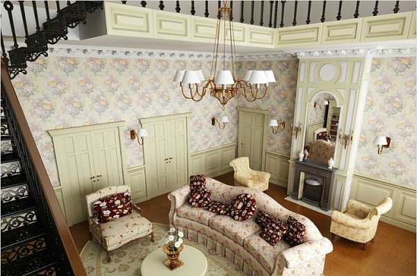 В гостиной необходимо создать ощущение наполненности светом и солнцем. Здесь необходимо использовать винтажную мебель, чехлы, декоративные подушки, статуэтки, вазы с цветами. Картины, зеркала, семейные фото подойдут в качестве украшений интерьера. Обязательна тяжелая люстра с коваными элементами или изысканные бра из латуни или бронзы.