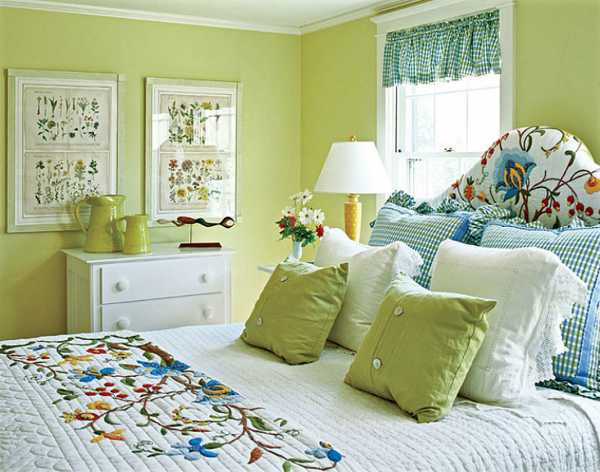 Еще один любимый цвет в стиле прованс – оливковый. Приветствуется присутствие вышивки и живых цветов в интерьере спальни. Характерная черта стиля – клетчатые ткани, которые часто служат связующим звеном между разными элементами интерьера.