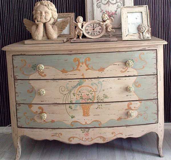 - Винтажный шкаф или комод можно оформить техникой декупаж и придать эффект старины;