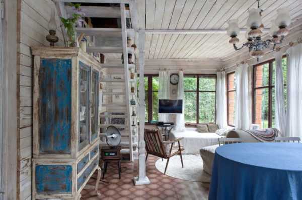 На фото компактный интерьер деревянного дома в стиле прованс.