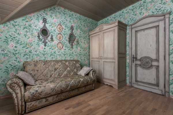 На фото спальня в стиле прованс с цветочным узором на обоях и состаренной мебелью из дерева.