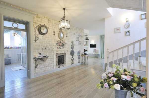 Необычным интерьерным решением станет отделка стен камнем. Напольное покрытие так же выполняют из камня или ламината. Светлые оттенки отделки и мебели сделают прихожую просторнее. Не стоит размещать современный шкаф-купе, гармоничнее будет смотреться вместительный винтажный шкаф с состаренным эффектом. Зеркало в прихожей украсит деревянная рама той же техники отделки, что и шкаф.