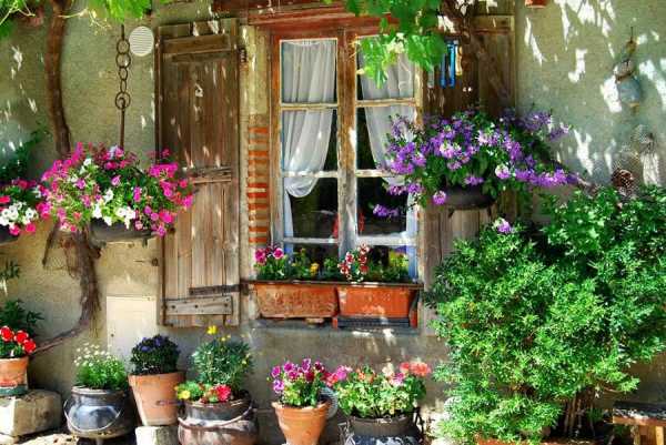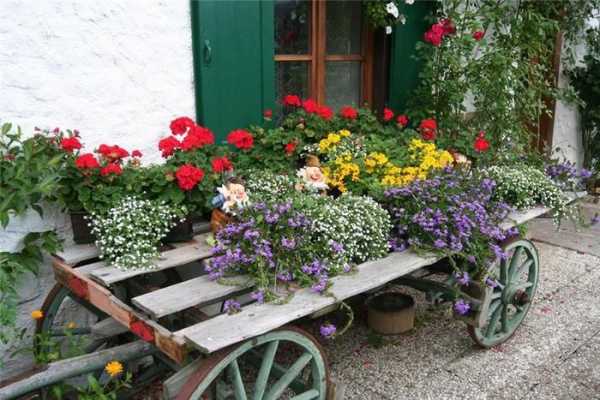 Очарованием оформления цветочных композиций является использование любой старой вещи в качестве цветочного горшка, отлично подходят для этих целей надбитые керамические горшки, старая посуда, разукрашенное цинковое ведро, и даже старый башмак или сапог. На вид эти цветочные композиции незатейливые, но выглядят необычно, красочно и эффектно.