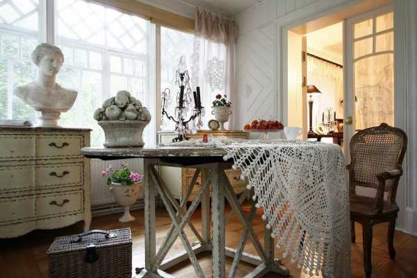 Особое внимание при создании прованского стиля следует уделить подробной проработке деталей. Великолепная белоснежная фаянсовая и фарфоровая посуда, керамика, изящные кованые люстры и светильники, расписные цветочные горшки, скатерти и салфетки из натуральных тканей, вышитые в технике ришелье, либо вязанные крючком – каждая вещь добавляет свой штрих в окружающую обстановку.