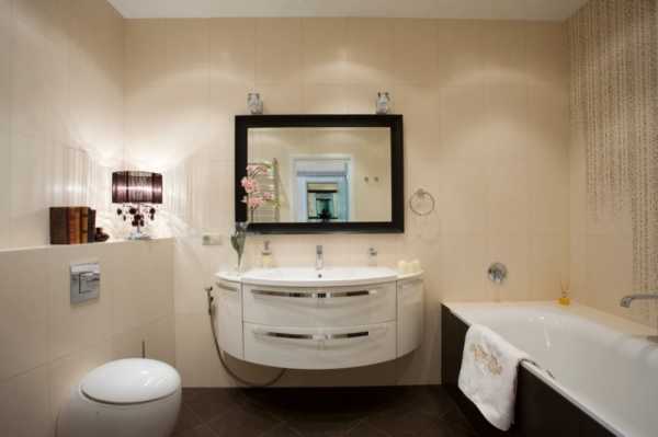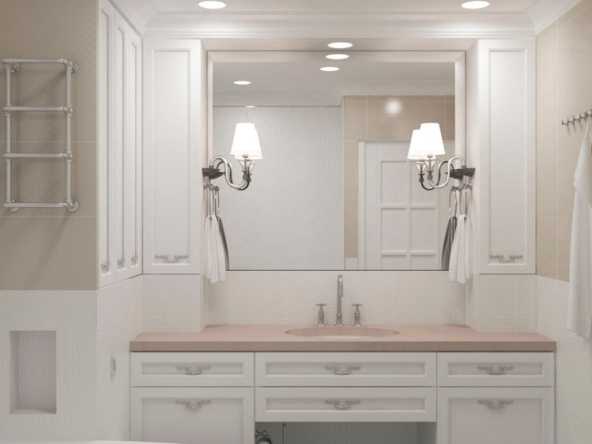 Над большой, удобной раковиной необычной овальной формы — зеркало во всю стену со встроенной подсветкой. Под столешницей, на которую опирается раковина — две полки для полотенец. Ванная оборудована водонагревателем, который скрыт от глаз в специальной нише.