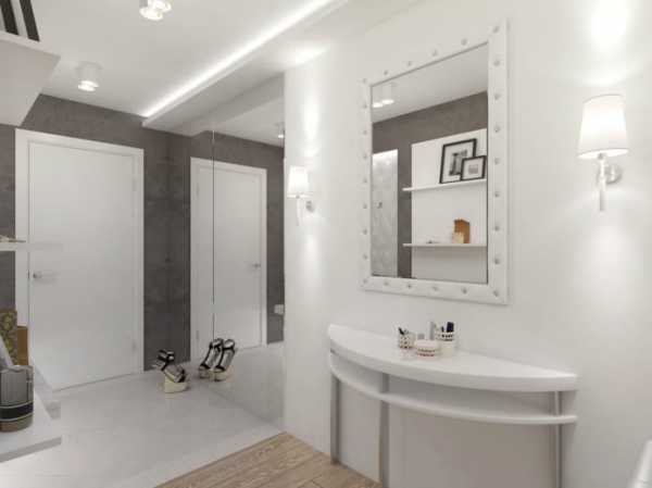 Небольшой столик-консоль с принадлежностями для макияжа, зеркало над ним и два изящных бра по бокам позволят привести себя в порядок перед выходом из дома, а зеркало во всю стену напротив вешалки — оглядеть себя с головы до ног. Оно также зрительно расширяет небольшое пространство и делает его светлее.