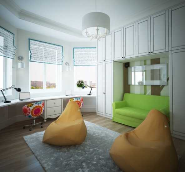 Рабочая зона выглядит весьма просторно, за счет использования в роли стола подоконника. Чтобы интерьер не был скучным, дизайнер внес несколько ярких штрихов. Салатный диван, персиковые кресла-мешки, стулья с узором ярко-красного цвета смотрятся красочно и позитивно.