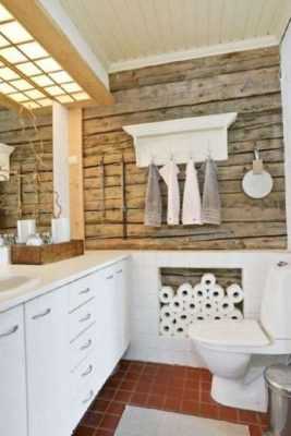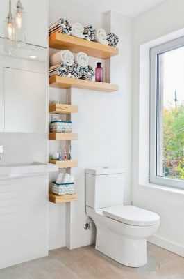 Можно разместить и небольшие полочки на боковых стенах, приподняв их как можно выше, чтобы они не мешали тому, кто сидит на унитазе.