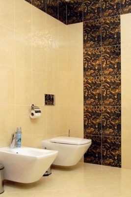 Темные вставки и имитация дорогих благородных материалов позволит создать классический интерьер санузла. Песочные оттенки плитки с египетским или греческим орнаментом и изогнутые линии воссоздадут интересный дизайн в античном стиле. А холодные оттенки плитки с эффектом старины создадут настроение рококо.