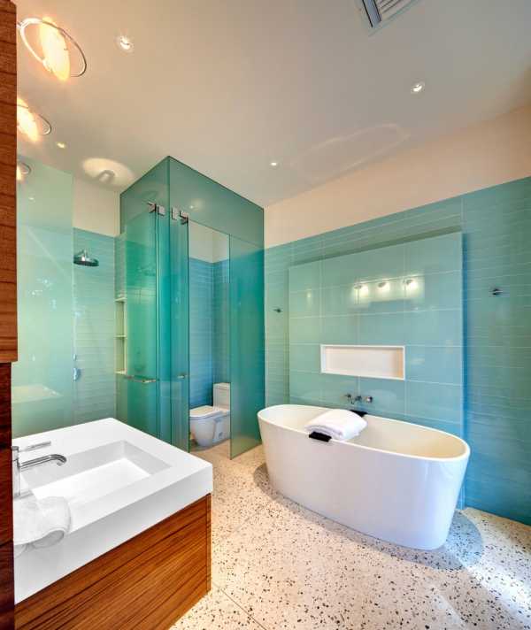 Что может быть лучше, чем синий цвет в ванной комнате? Правильно: цвет тиффани. Он будто специально был создан для этого помещения, так как навевает мысли о лазурной воде Средиземного моря. Чтобы разнообразить ровные поверхности, выбирайте плитку в форме кирпичиков или чешуи в бирюзовых оттенках. В качестве компаньонов к нему подойдут белый, коричневый, бежевый. Творческие личности могут замахнуться на желтые или оранжевые цвета.