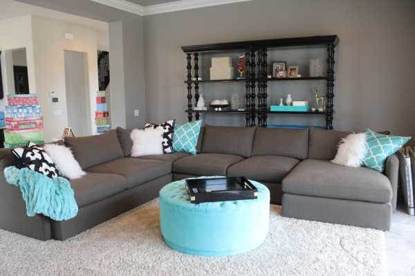 - Гостиная прекрасно подходит для ярких оттенков бирюзы в качестве доминирующего цвета. Не стоит пытаться заглушить его другим, ведь Тиффани специально создан для того, чтобы вести лидирующую партию. Если хочется больше ярких элементов, добавьте детали в оранжевом цвете. Получится некая восточная классика, которая придаст эффект свежести и современности.