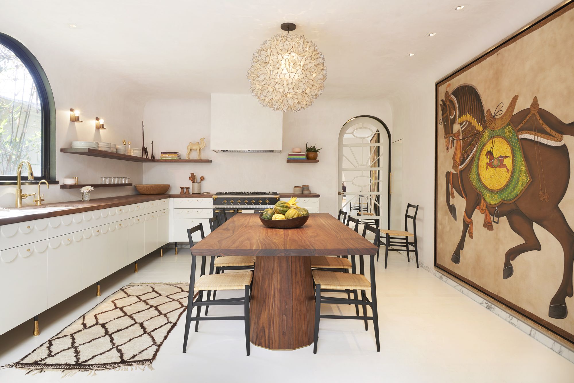 Это блестяще-белый интерьер с арочным входом над паркетным полом, увенчанным плетеным ковриком.Темные элементы в сочетании с землистыми тонами стратегически расположены, чтобы сбалансировать абсолютную белизну. В некоторых из этих элементов есть оттенок модернизма, который, кажется, вписывается в общую эстетику.
