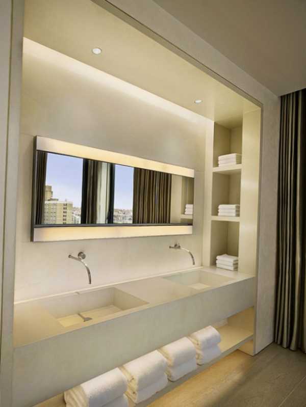 - Что касается освещения, то оно должно быть разнообразным. Не стоит ограничивать тремя точечными светильниками на потолке. Разместите рядом с зеркалом настенные светильники. Подсветите полки с помощью светодиодной ленты – цвет освещения можно изменять. При желании можно организовать даже встроенную в пол подсветку.
