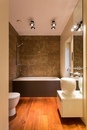Здесь необходимо организовать основное освещение – установить один потолочный светильник или систему точечной подсветки, а также добавить несколько локальных источников света, например, бра, освещающие зеркало, подсветку душевой кабины, а иногда и пола.