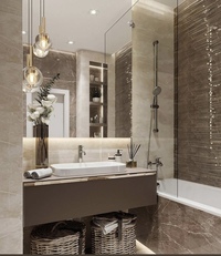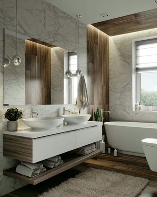 К отделочным материалам для ванной в современном стиле выдвигаются только практические требования, а визуальный образ может варьироваться в зависимости от дизайн-проекта.