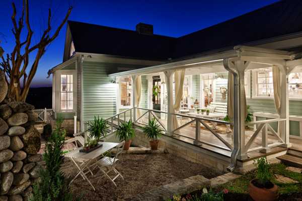 Это прежде всего деревенский уют, шарм и наивность. Самодельные или вручную вышитые салфетки, не покрытые эмалью горшки, лоскутные одеяла, побеленный потолок и стены в мелкий цветочный узор – эта веранда будет отличным местом для тихих уютных посиделок.