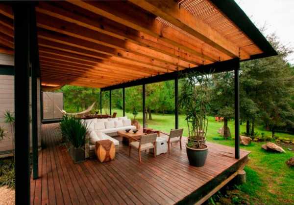 В открытых верандах больше света и воздуха, они дешевле и легче в строительстве. В качестве границ будет достаточно установить перила по периметру помоста или вовсе высадить вьющееся растение, которое постепенно само создаст живую изгородь.