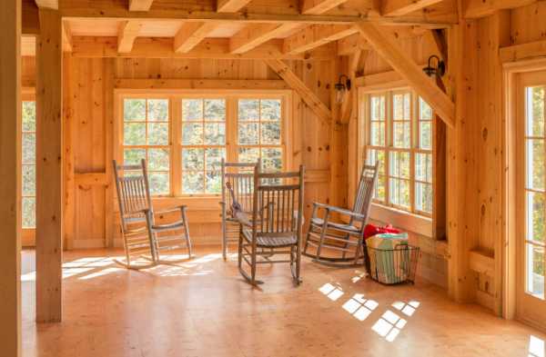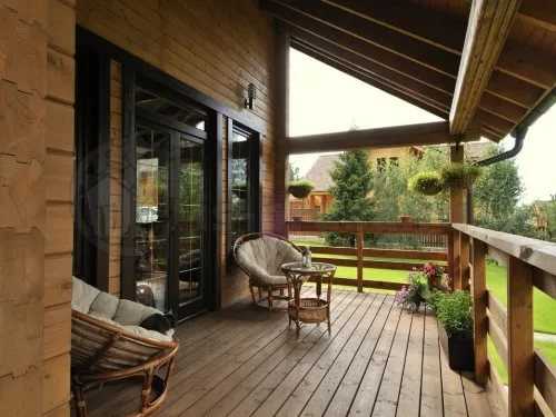 Пространство веранды напоминает домик в альпийских горах. Тут приветствуется сочетание дерева и камня, теплых оттенков и уютных фактур. В стиле шале лучше всего оформлять деревянные пристройки, придерживаясь основ концепции: