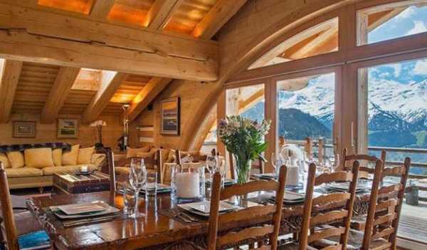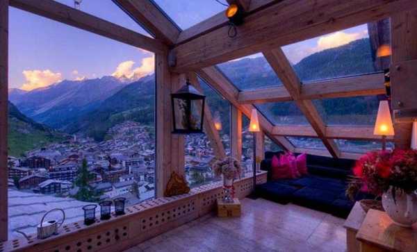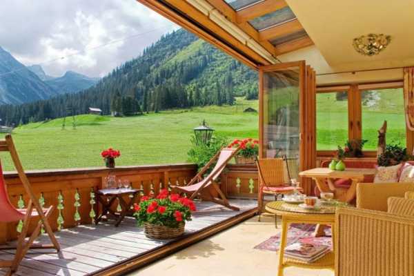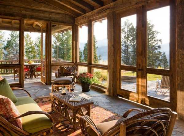 - уютную меблировку – веранда, оформленная в альпийском стиле шале, как видно на фото, характеризуется массивными стульями с мягкими спинками, коврами из овчины, мягкими диванами с подушками и грубыми столешницами;
