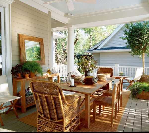Идеально в дизайн веранды загородного дома впишется плетеная мебель из соломки, ветвей, ротанга, лозы. Она легкая, и ее можно быстро убрать в случае дождя, она не деформируется от влаги и быстро сохнет, не плесневеет.