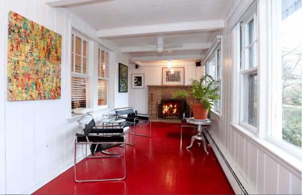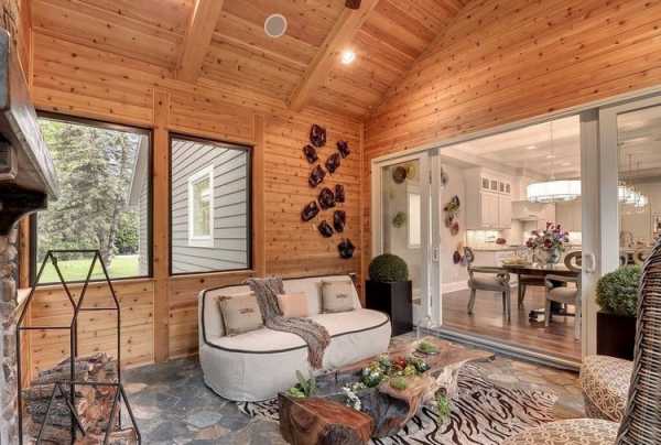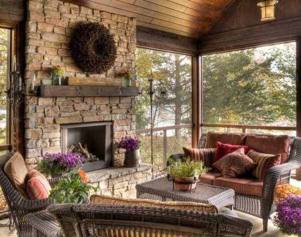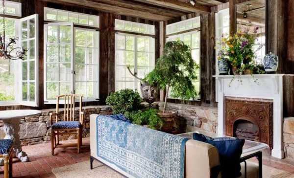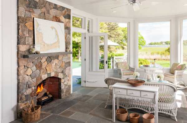 Если говорить об оформлении полов, то мнения дизайнеров по поводу интерьера веранды разнятся. Некоторые ратуют за продолжение использования отделочных материалов, которые применялись во всех остальных комнатах домовладения. Другие же, предлагают более практичные альтернативы. Если у вас есть дети, которые забегают на веранду из сада в грязной обуви или домашние питомцы, поступающие аналогично, то едва ли ламинат на веранде сможет прослужить долго от бесконечного мытья. Более практичным вариантом станет облицовка керамогранитной плиткой или использование натурального камня. К тому же, если ваша веранда оснащена камином, то отделка пространства вокруг него с помощью камня, использованного и для напольного покрытия, поможет создать невероятно гармоничный, целостный образ помещения.