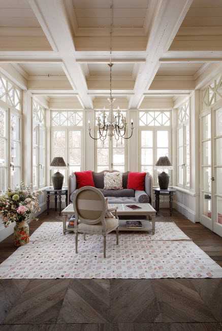 Как видно на фото интерьера, помещение отличается деревянной отделкой. Кантри-пространство и веранда в стиле прованс схожи по оформлению, но в первом случае использует широкая палубная доска. Обустройство комнаты основывается на следующих принципах: