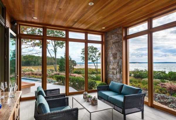 Невольно, у многих их нас веранда ассоциируется с деревянным сооружением. И это неудивительно, ведь именно из древесины чаще всего строились летние веранды. В дальнейшем дерево стали комбинировать со стеклом для получения закрытого внесезонного пространства. Именно поэтому дерево в качестве строительного и отделочного материала используется очень широко в современных дизайн-проектах. Обилие стеклянных поверхностей позволяет практически стереть границу между внутренним убранством веранды и внешним пейзажем. В свою очередь деревянная отделка привносит природную теплоту в атмосферу помещения.