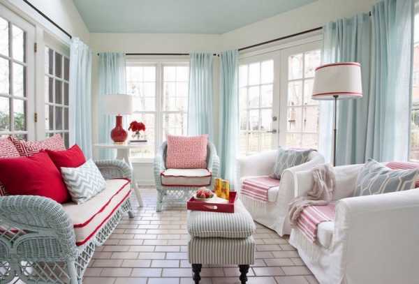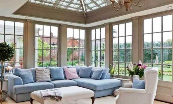 - В случае, когда веранда будет располагаться с южной стороны — рекомендуется сделать интерьер в стиле средиземноморского прованса. Он предусматривает преобладание голубого цвета, при этом красиво комбинируется как в плане отделки самой веранды, так и в оформлении её дополнительных аксессуаров (подушек, пледа и другого текстиля). Кроме основных моментов, важную роль будут играть и дополнительные компоненты в виде живых зелёных растений.