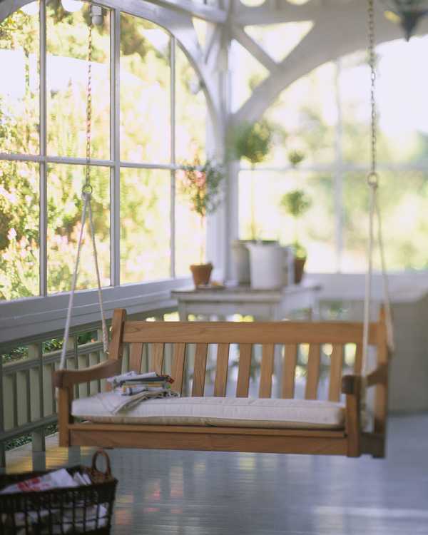 Отлично впишется в интерьер открытой веранды гамак. Кстати, именно текстиль во всех его проявлениях одомашнит и облагородит интерьер веранды. Позаботьтесь о деталях: скатерти, чехлы на стулья, тканевые римские шторы, подушки. Однако не забывайте, что все-таки веранда, особенно открытая, это больше уличное помещение, чем домашнее, поэтому пледы, подушки, одеяла и скатерти лучше хранить, скажем, в большом сундуке-скамье в прихожей.