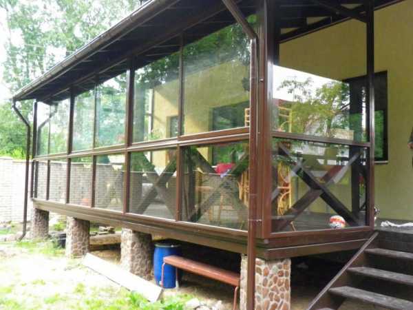 Оптимальный вариант для создания крыши веранды – односкатная пологая конструкция, которая позволит не задумываться о скапливании влаги (снега), а значит – прослужит гораздо дольше. Безусловно, строение веранды предполагает колоссальное использование стеклянных поверхностей – это могут быть как панорамные окна, так и стеклянные раздвижные стены, позволяющие легко трансформировать веранду в летнюю террасу с крышей.