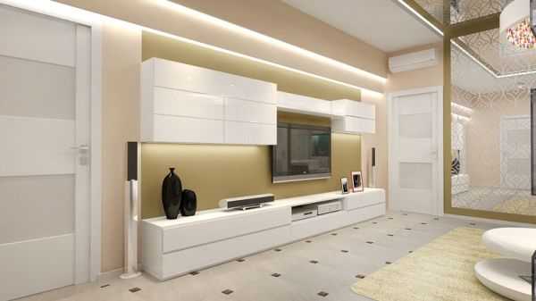 Остановить свой выбор стоит на мебели, которая на тон или два темнее стен либо уж совсем белого цвета. Как ни странно, в квартиру в интерьер гостиной впишется классическая стенка.