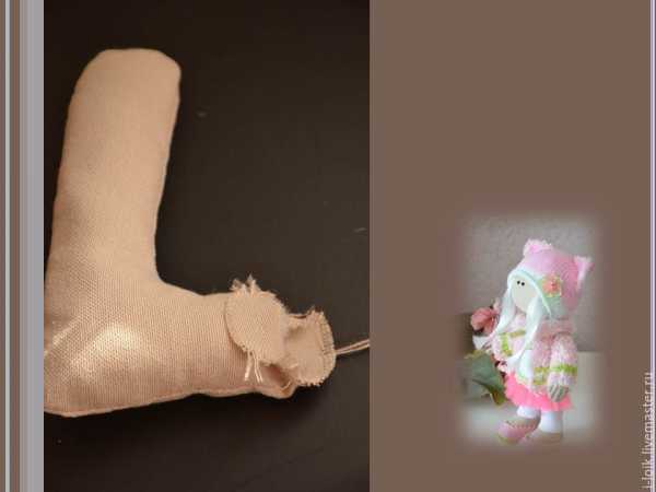 Надеваем штанишки. Сзади их присобираем и пришиваем к тельцу. Если они получились широковаты по ноге, то их можно присобрать на нитку и пришить к ножкам.