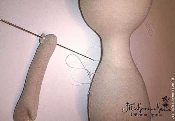 Фиксируем ножки к тельцу булавками, убеждаемся, что они прикреплены на одном уровне. Затем пришиваем их сквозь тело через пуговички. Такое крепление позволяет готовую куколку посадить, поворачивать у нее ножки и ручки.