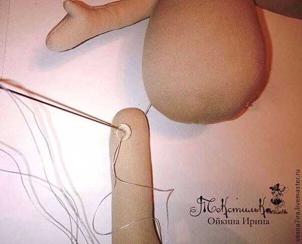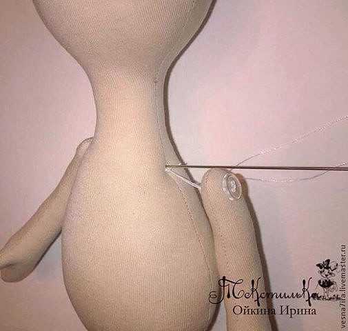 Теперь можно их зафиксировать на теле. Длинной иглой с двойной ниткой проходим сквозь тело, ручки захватываем лишь через их внутреннюю часть.