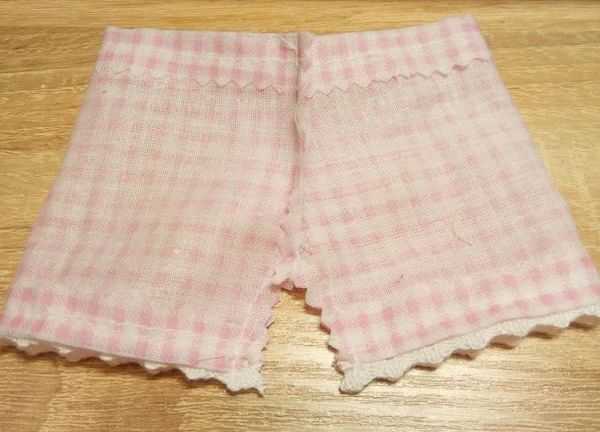 Приступаем к одежде. Выкраиваем панталончики. Берем ткань. Складываем лицом друг к другу. Рисуем нашу выкройку на ткани. Подшиваем сверху и снизу. А затем прошиваем верхние боковые швы.