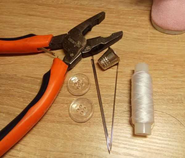 Далее для работы нам потребуются прочные нитки, длинная игла, пуговицы, наперсток и плоскогубцы.