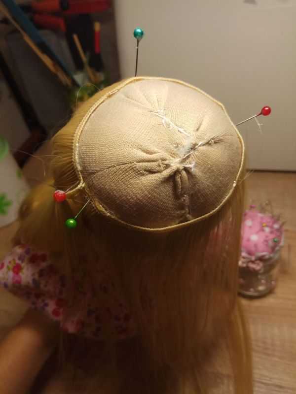 Сначала можно зафиксировать волосики на клей «Момент», а для надежности еще и пришить. Из оставшегося кусочка трессов длиной 8-10 см формируем пучок, его вставляем в небольшое отверстие на макушке.