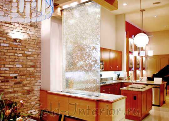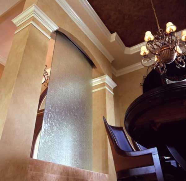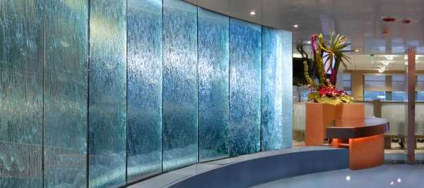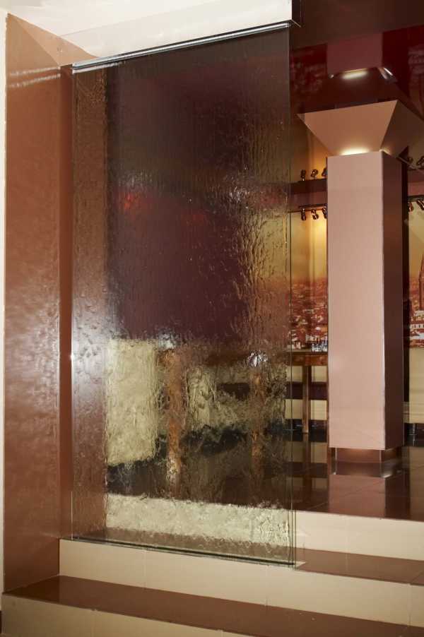 Водопады по стеклу в интерьере привлекают внимание и визуально увеличивают объем помещения. Необходимо убедиться в устойчивости конструкции, возможно, укрепить ее дополнительными фиксаторами. Возможно использование зеркальной поверхности или матового стекла, а также декорирование поверхности пленкой с рисунком.