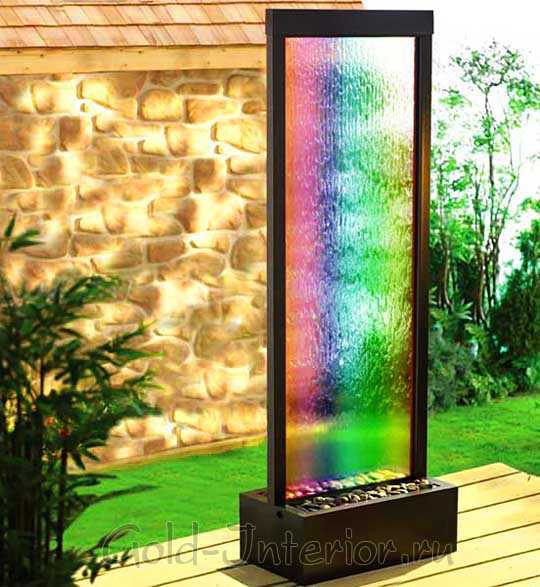 - Стекло можно заменить на более дешевый и доступный пластик, что, к тому же сделает вес аксессуара меньше. А благодаря новейшим технологиям окрашивания, ваш водопад в интерьере будет переливаться всеми цветами радуги.