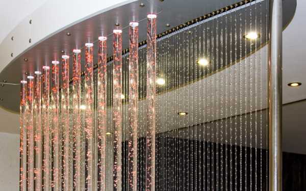 - Капельные водопады – они понравятся тем, кто хочет тишины, ведь струящаяся по стеклу вода не создает шума, капли стекают маленькими струйками, нередко устроенными в стеклянных трубочках или между стеклами. Подсветка сделает водопад разноцветным. Технологии производства их таковы, что даже разбив стекло вы не получите осколков. Поверх стекла наносится специальная пленка, не позволяющая возможным осколкам разлетаться. Подобные элементы декора можно увидеть в лобби-зонах отелей или в залах ожидания. Представленный водопад в интерьере хорош и в миниатюрных размерах для разделения комнат, например, может служить перегородкой между зонами кухни и отдыха, прихожей и гостиной. Разнообразие форм делает его многофункциональным: прямоугольные и большие подойдут, как перегородки; прямоугольные и маленькие ‒ заменят ширму, а небольшие круглые легко заменят собой настенные картины. Доступны также и е триптихи (водопад, разделенный на три части и очень похожий на картину). У заказчика всегда есть возможность подобрать размер и форму капельного водопада практически любых размеров и самых разнообразных дизайнерских решений.