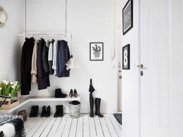 - Эффективность использования пространства. Обувь, одежду и аксессуары по возможности следует прятать в шкафы и тумбы. Большое количество этих предметов создаёт эффект захламлённости, чего нужно избегать любыми способами.