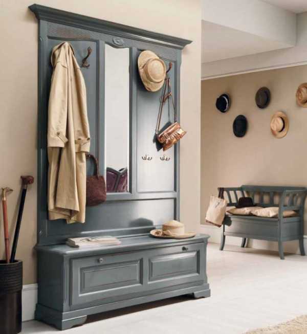 При очень маленьких размерах помещения можно ограничиться комодом, выполняющим роль места для переобувания. Над комодом размещается зеркало. Еще более простой вариант – настенная вешалка с сидением и полочкой для головных уборов.