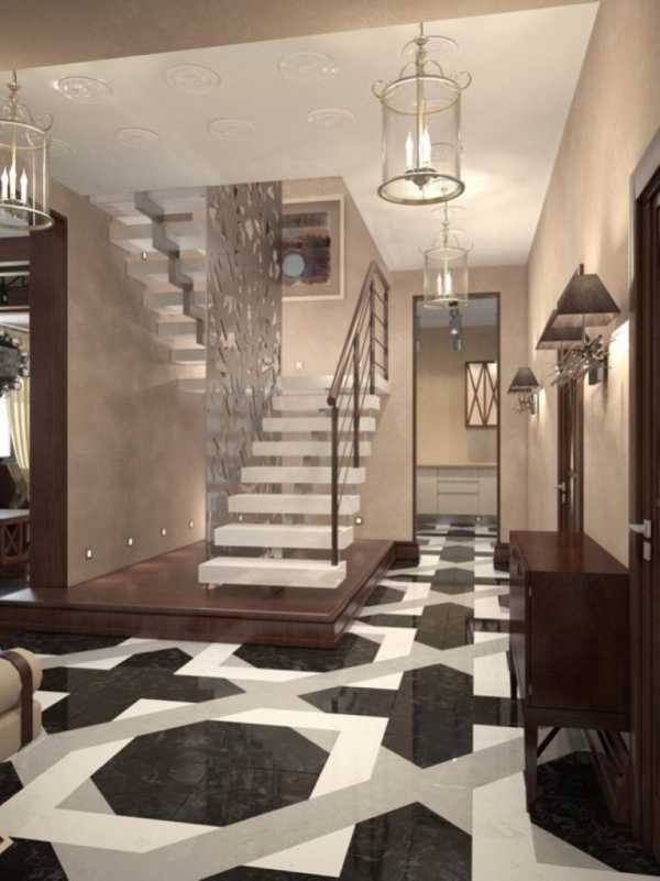 Пол и потолок имеют большое значение при оформлении дизайна коридора в квартире. Фото необычных решений поможет выбрать собственный стиль. Для длинной прихожей прекрасным вариантом станет использование различных покрытий для разных зон. У входа применяется плитка, а в проходной зоне паркетная доска или ламинат. Укладка напольного покрытия по диагонали позволяет добавить объема.