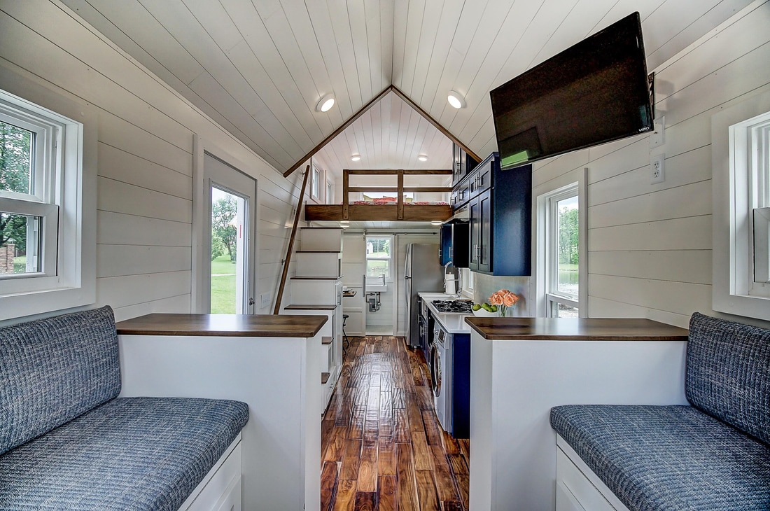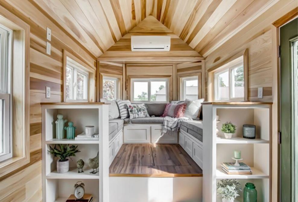 . Однако не всем крошечным домам нужны расширяемые комнаты, чтобы их обитатели чувствовали себя комфортно. Clover от Modern Tiny Living — это дом с приподнятой U-образной жилой зоной, окруженной окнами, что делает его идеальным местом для развлечений (по крайней мере, в мире крошечных домов).