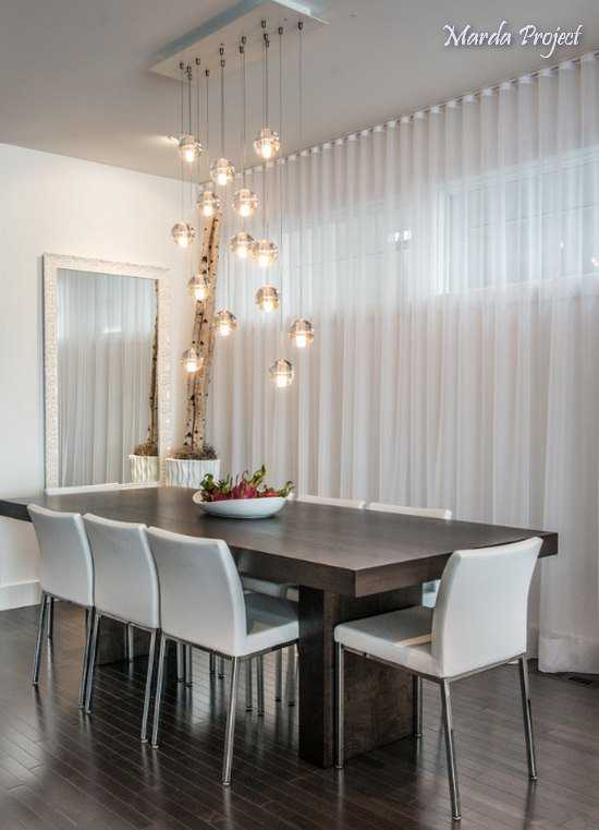 Отдельно стоит сказать о освещении. Поскольку, у нас проводятся праздничные застолья в гостиной, то нотки торжественности только к месту. Таким символов в ней считается люстра. Внимательно подобранный вариант, отражает одновременно и идею праздника и стиль интерьера в котором оформлена комната. По правилам современного дизайна интерьера, принято обеденную зону выносить в гостиную. Люстру вешают над столом ровно по центру.