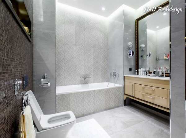 В интерьере ванной оформление стен признак благородности. Декорированная фронтальная стене мозайкой или плиткой с фотопечатью выступит как панно. Тематику для этого выбирают, как и подобает там, где много воды, морскую. Хотя это зависит от стилистики. Допустим, для классического дизайна оправдано применение изображений с греческими мотивами. Если ванная маленькая, панорамное изображение на стене произведет положительный эффект: зрительно она становится больше, да и выглядит таким образом дизайн ванной комнаты стильно. Большое зеркало в ванной, даст тот же эффект в интерьере.